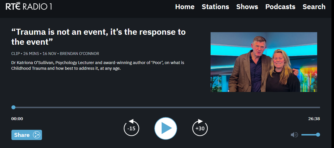 Clip • 26 Mins • 16 NOV • Brendan O'Connor interview with Dr Katriona O’Sullivan, Psychology Lecturer and award-winning author of ‘Poor’, on what is Childhood Trauma and how best to address it, at any age.