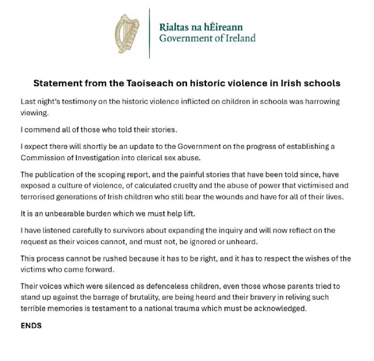 We welcome the public statement by An Taoiseach in November 2024 in the aftermath of the RTE Leathered documentary reproduced below